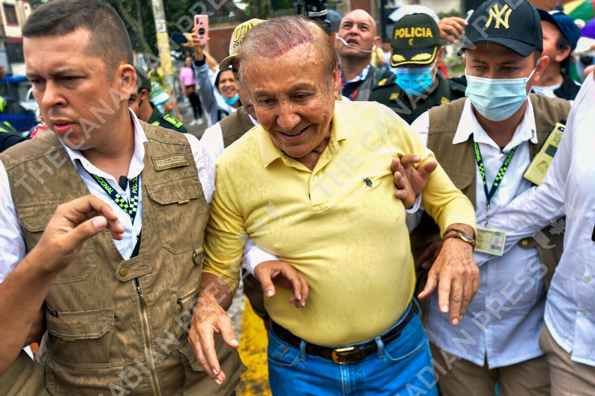 Rodolfo Hernandez, presidential candidate with the League of Anti-Corruption Leaders, leaves a polling station after voting in the presidential election in Bucaramanga, Colombia, Sunday, May 29, 2022. The 77-year-old populist took one of the top two spots in the country's presidential election as a surprise candidate and is now headed to a runoff on June 19th. (AP Photo/Mauricio Pinzon)
