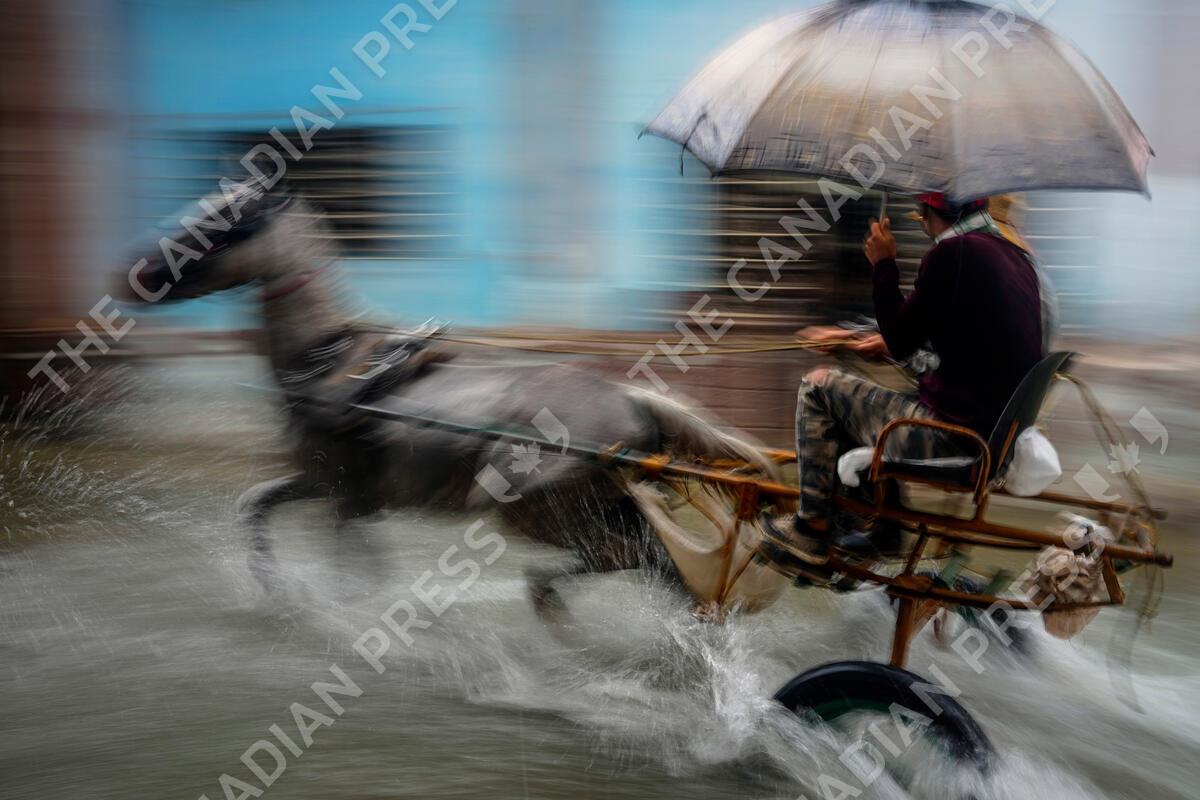 A horse pulls a buggy with passengers through a street flooded by heavy rains, in Havana, Cuba, Friday, June 3, 2022. Tropical storm Alex has drenched Cuba with almost non-stop rain for the last 24 hours as it moves across the southeastern Gulf of Mexico toward Florida. (AP Photo/Ramon Espinosa)