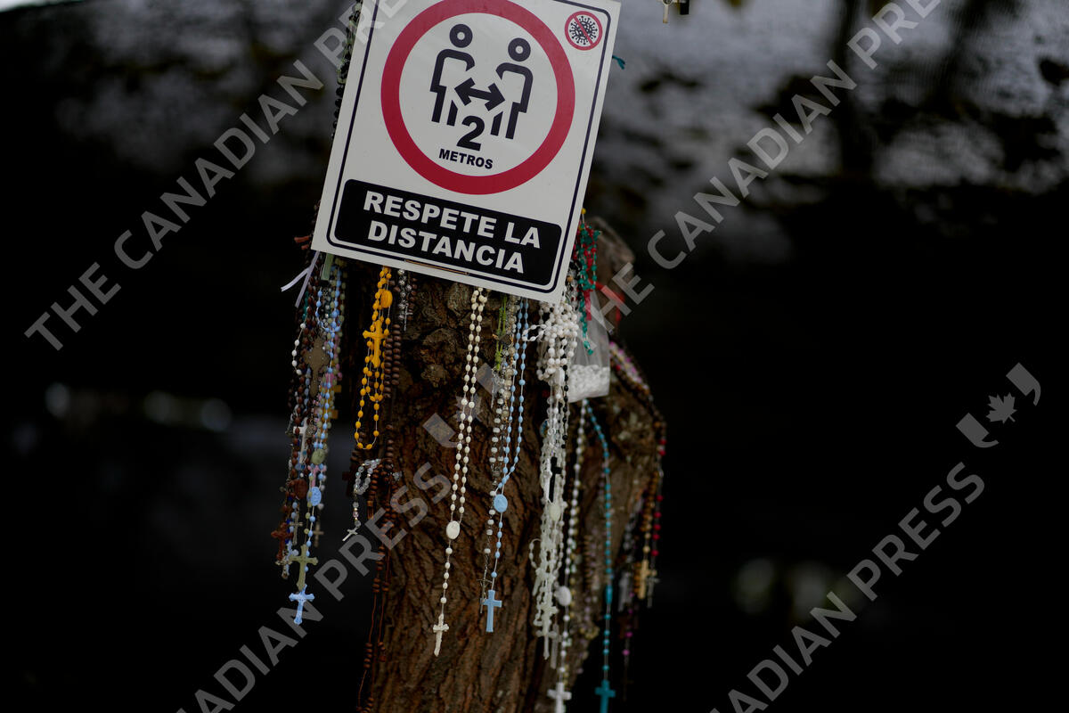 Rosary beads hang by a sign asking people to keep their distance amid the COVID-19 virus outside the sanctuary of the "Madonna del Cerro" formally called La Inmaculada Madre Del Divino Corazón EucarÃstico De Jesús, in Salta, Argentina, Monday, May 2, 2022. The "Madonna del Cerro" is a popular figure in Salta who a woman in the province said appeared to her in a vision in the 1990s. (AP Photo/Natacha Pisarenko)