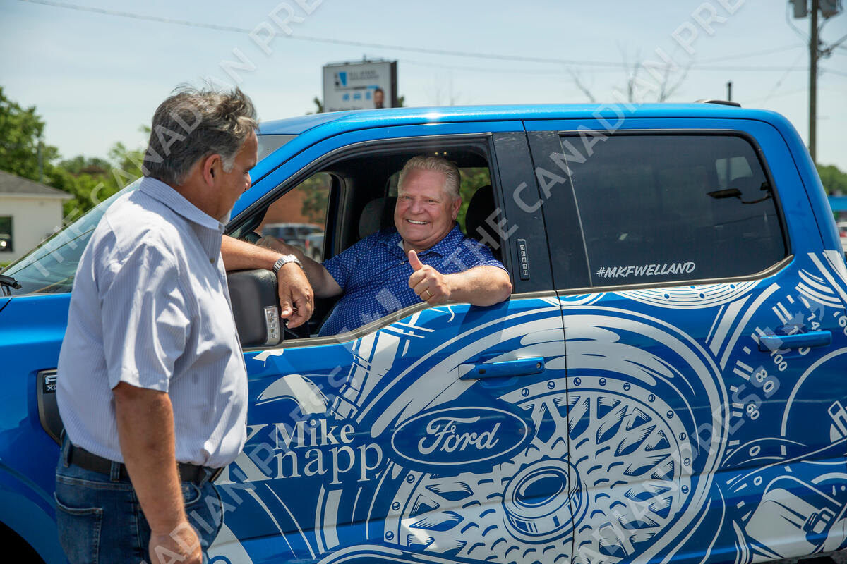 Ontario PC candidate for Niagara Centre, Fred Davies joins Ontario PC Leader Doug Ford during a campaign stop at the Mike Knapp Ford dealership in Welland, Ont., on Tuesday, May 31, 2022. THE CANADIAN PRESS/Tara Walton