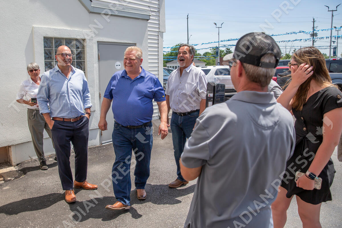 Ontario PC candidate for Niagara Centre, Fred Davies, right, joins Ontario PC Leader Doug Ford during a campaign stop at the Mike Knapp Ford dealership in Welland, Ont., on Tuesday, May 31, 2022. THE CANADIAN PRESS/Tara Walton