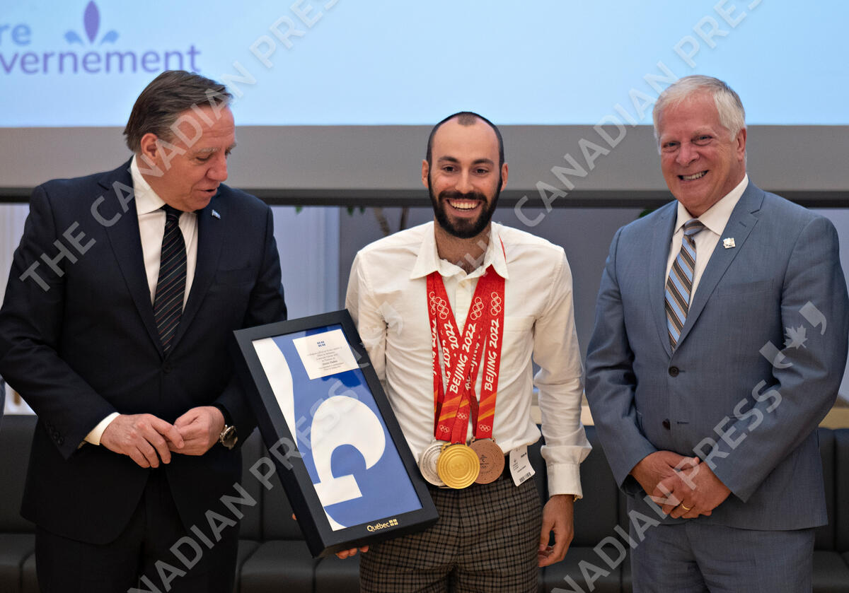 Canadian Olympian Steven Dubois holds the Quebec flag that was flying at the centre tower of the National Assembly when he won a competition and wears his three short track speedskating medals he won at the 2022 Beijing Olympics, during a ceremony to honour winter Olympians and Paralympians, Tuesday, May 31, 2022 at the legislature in Quebec City. Dubois is flanked by Quebec Premier Francois Legault, left, and House Speaker Francois Paradis. THE CANADIAN PRESS/Jacques Boissinot