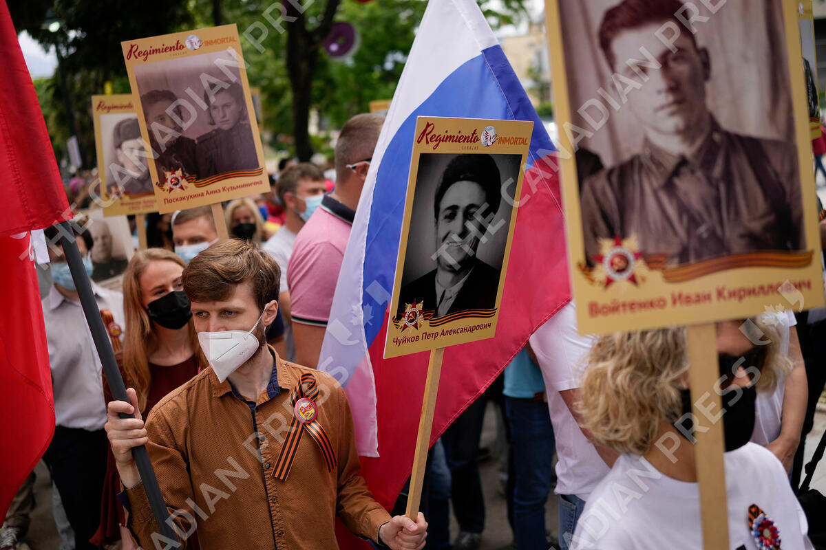 Russian nationals hold posters depicting family members who were killed in WWII during an Immortal Regiment march to commemorate those who fought and died during that war and the victory over Nazism, at Los Proceres Boulevard in Caracas, Venezuela, Saturday, May 7, 2022. The march, an annual May 9th Russian event that marks their Victory Day, was held in Venezuela for the first time. (AP Photo/Matias Delacroix)
