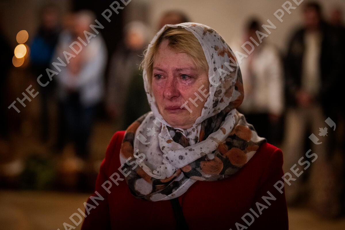 Olga Zhovtobrukh, 55, cries during an Easter religious service at a church in Bucha on the outskirts of Kyiv, on Sunday, April 24, 2022. (AP Photo/Emilio Morenatti)