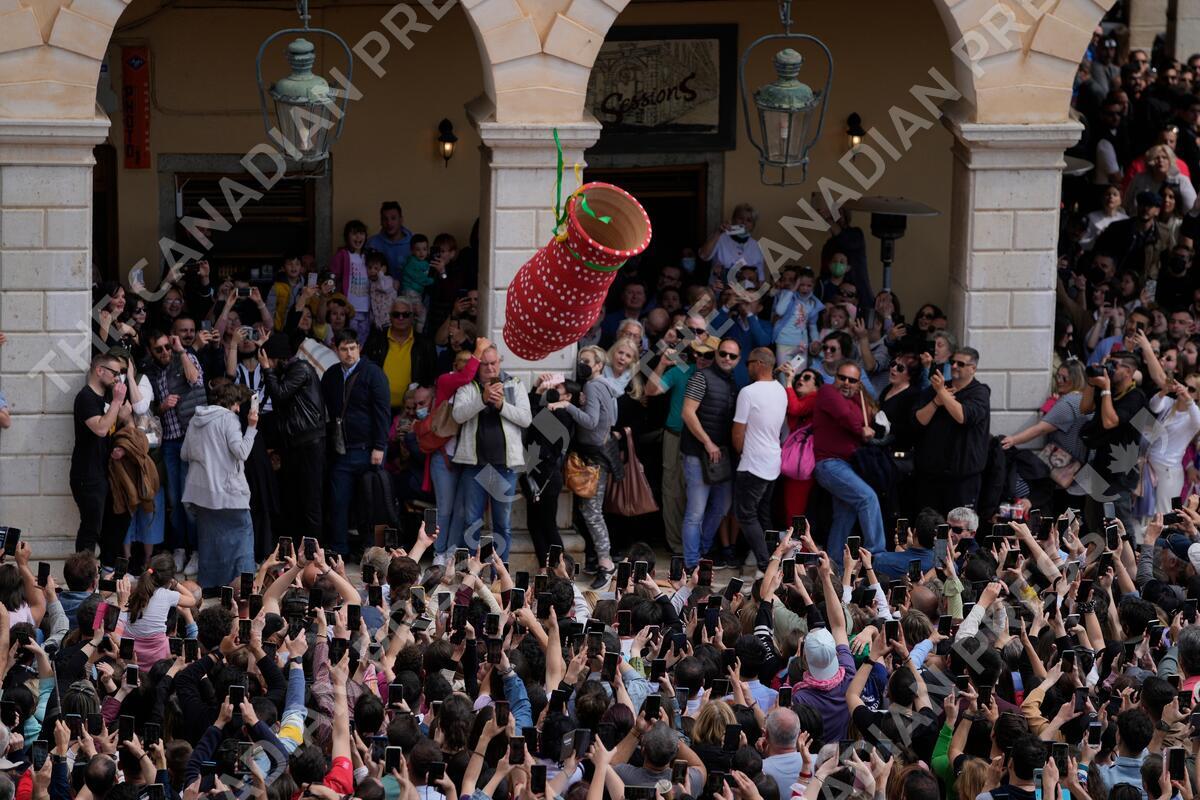 People throw a huge clay jar from a balcony as visitors use their cellphones to film the custom called "botides" on the Ionian Sea island of Corfu, northwestern Greece, on Good Saturday, April 23, 2022. For the first time in three years, Greeks were able to celebrate Easter without the restrictions made necessary by the coronavirus pandemic. (AP Photo/Thanassis Stavrakis)