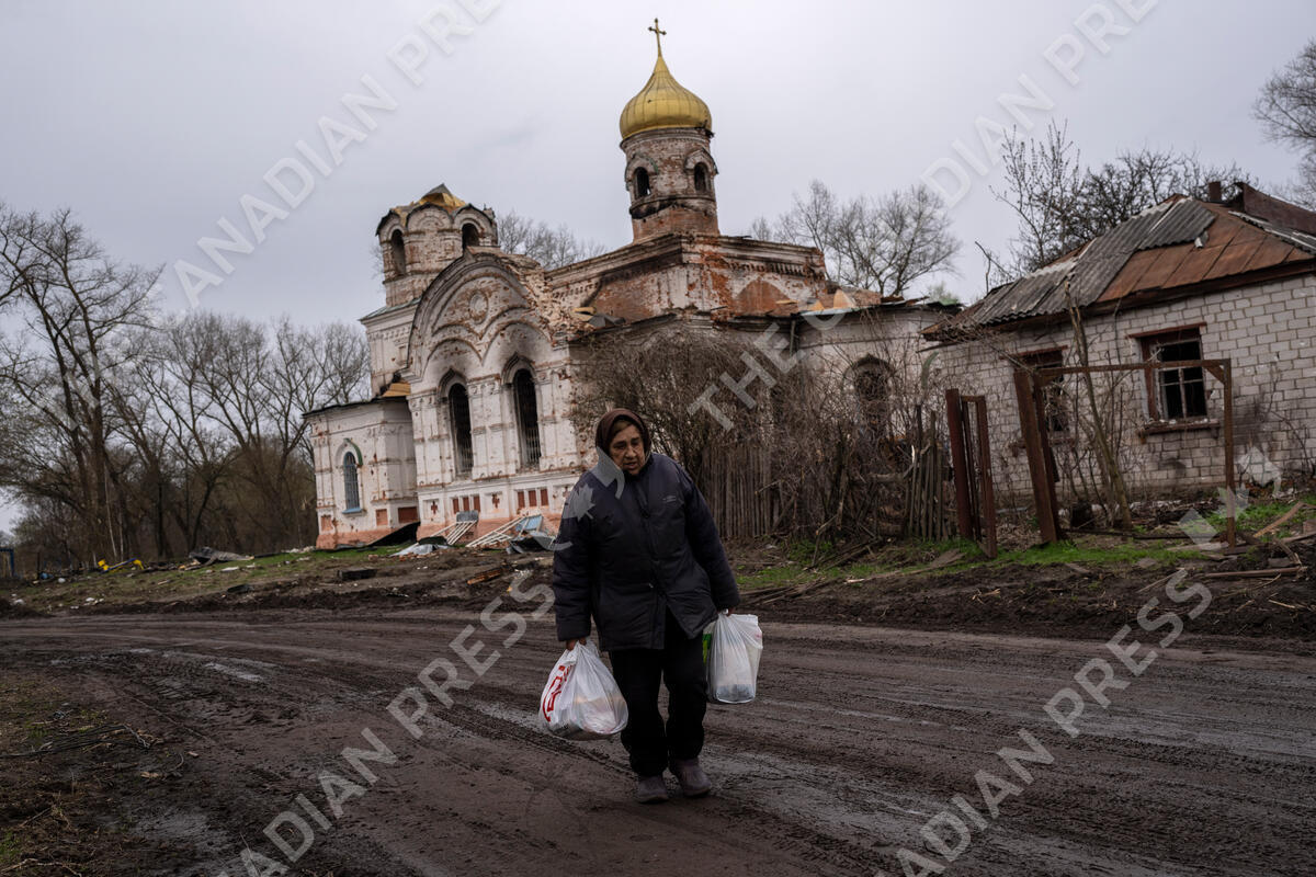 Valentyna Bushtruk, 70, walks in front of a damaged church in Lukashivka in northern Ukraine, Friday, April 22, 2022. Residents said Russian soldiers used the house of worship for storing ammunition and that Ukrainian forces shelled the building to make the Russians leave. (AP Photo/Petros Giannakouris)