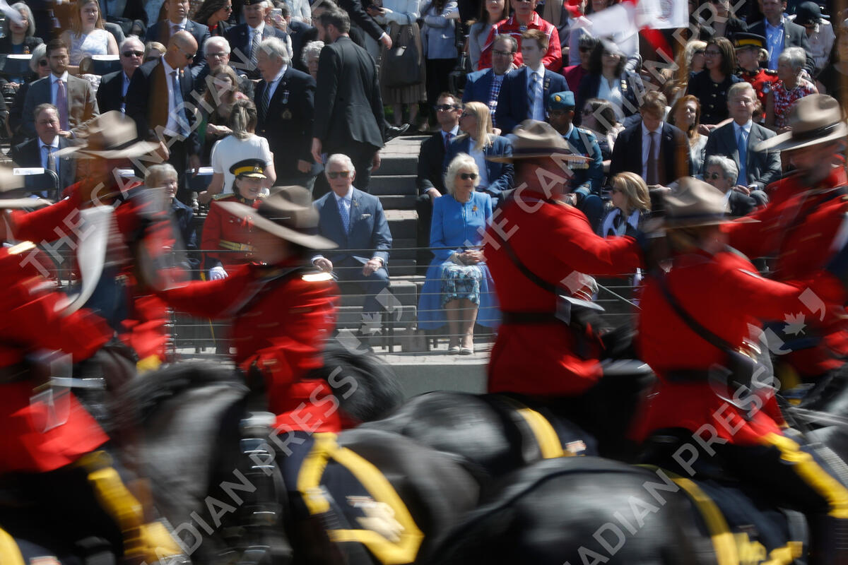 British Prince Charles and Camilla, Duchess of Cornwall watch the Royal Canadian Mounted Police (RCMP) Musical ride performance during the Royal tour in Ottawa, Ontario on Wednesday May 18, 2022. THE CANADIAN PRESS IMAGES/Lars Hagberg