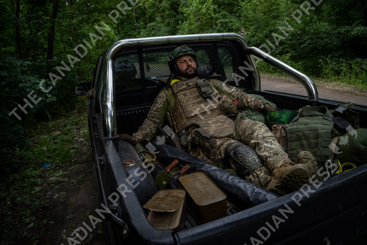 A Ukrainian serviceman pauses before going back to the frontline in the Donetsk oblast region, eastern Ukraine, Sunday, June 5, 2022. (AP Photo/Bernat Armangue)