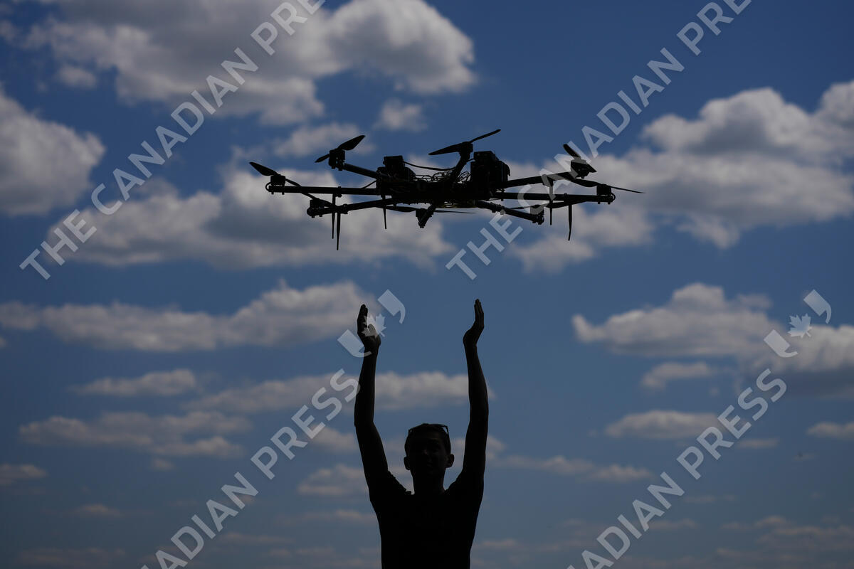 Oleg flies a drone while testing it on the outskirts of Kyiv, Ukraine, Wednesday, June 8, 2022. Drones are been extensively used by Russian and Ukrainian troops on the war. (AP Photo/Natacha Pisarenko)
