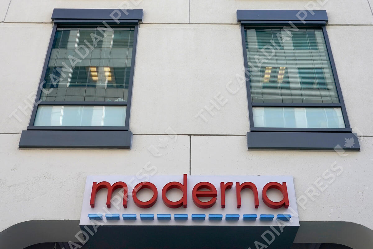 FILE - In this Dec. 15, 2020, file photo, a sign for Moderna, Inc. hangs on its headquarters in Cambridge, Mass. Moderna's experimental COVID-19 vaccine that combines its original shot with protection against the omicron variant appears to work, the company announced Wednesday, June 8, 2022. COVID-19 vaccine makers are studying updated boosters that might be offered in the fall to better protect people against future coronavirus surges.(AP Photo/Elise Amendola, File)