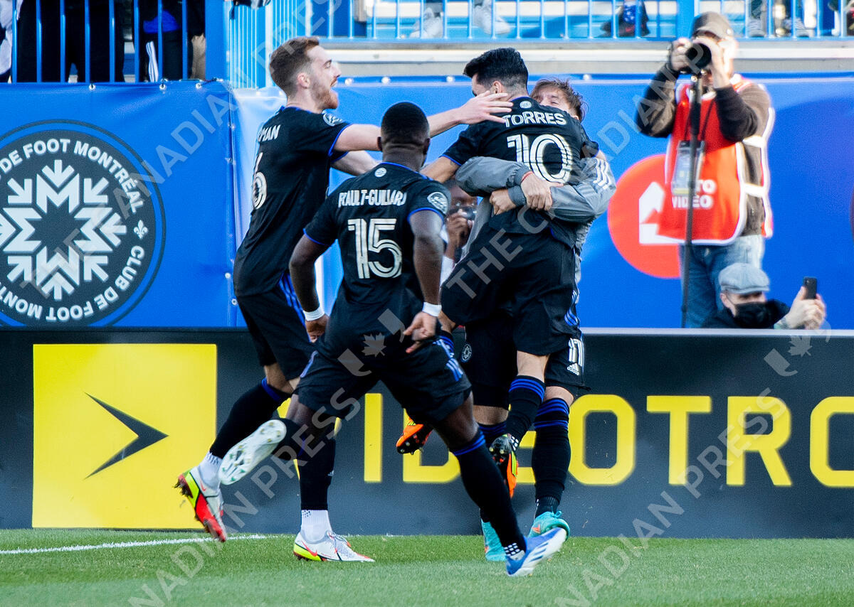 CF Montreal players celebrate a goal by Joaquin Torres (10 against Atlanta United during second half MLS soccer action in Montreal, Saturday, April 30, 2022. THE CANADIAN PRESS/Graham Hughes