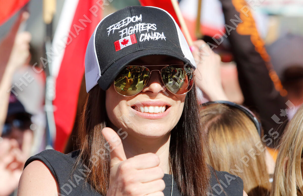 A person takes part in a demonstration, part of a convoy-style protest participants are calling "Rolling Thunder", in Ottawa, on Saturday, April 30, 2022. THE CANADIAN PRESS/ Patrick Doyle