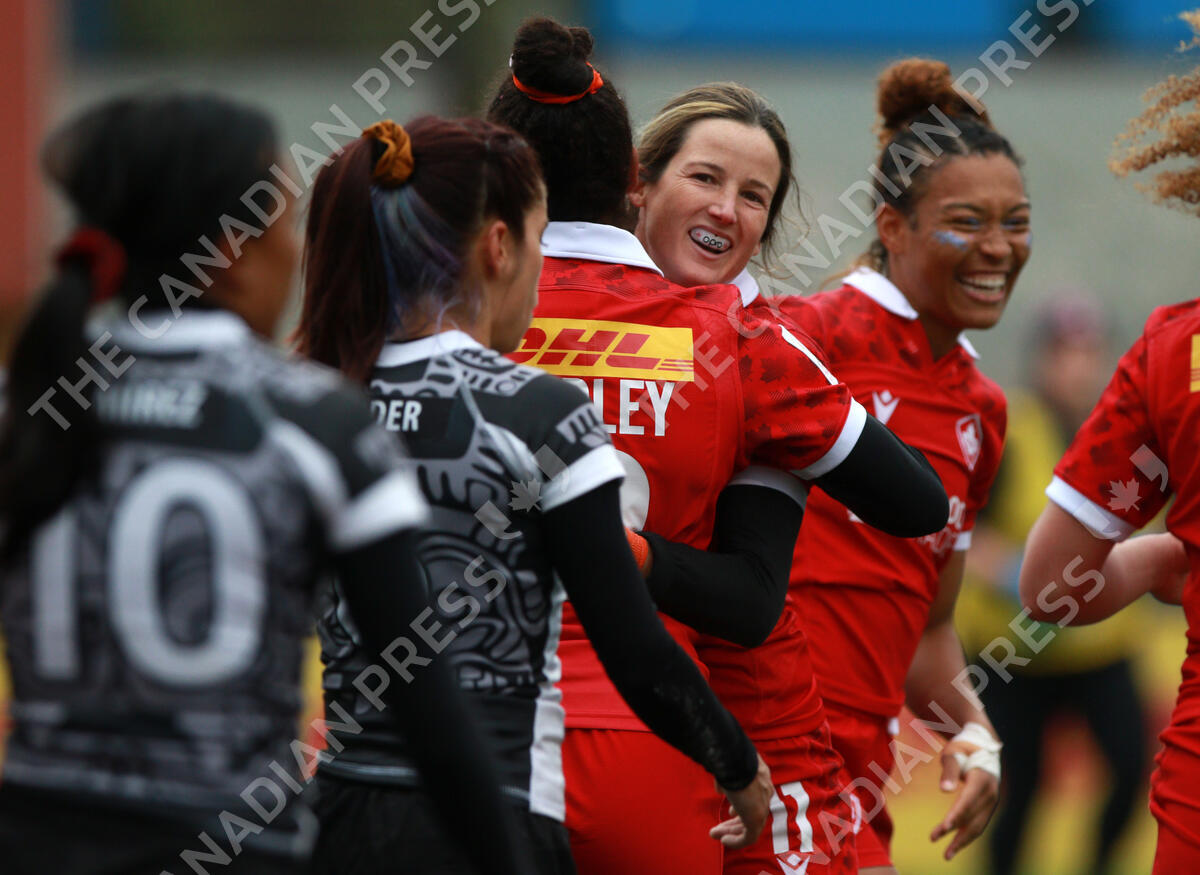 Canada's Elissa Alarie celebrates with teammates after making the try against Mexico's during the second half of rugby action at the HSBC World Rugby Women's Sevens Series at Starlight Stadium in Langford, B.C., on Saturday, April 30, 2022. THE CANADIAN PRESS/Chad Hipolito