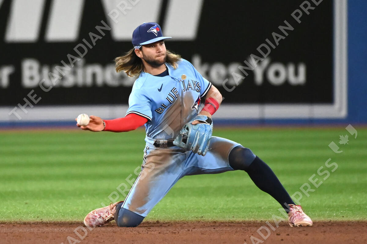 Toronto Blue Jays’ Bo Bichette throws out Houston Astros’ Jordan Alvarez at second base pitches in the seventh inning of an American League baseball game in Toronto on Saturday April 30, 2022. THE CANADIAN PRESS/Jon Blacker