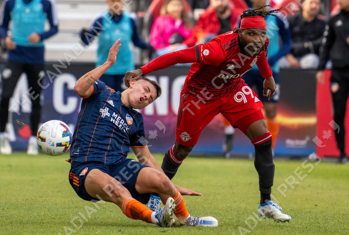 Toronto FC forward Ifunanyachi Achara (99) picks up a yellow card as he fouls FC Cincinnati midfielder Alvaro Barreal (31) during second half MLS action against Toronto FC in Toronto, Saturday, April 30, 2022. THE CANADIAN PRESS/Frank Gunn