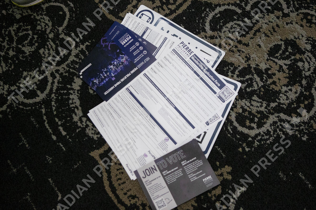 Membership forms lie on the floor as federal Conservative leadership candidate Pierre Poilievre holds a campaign rally in Toronto, Saturday, April 30, 2022. THE CANADIAN PRESS/Chris Young