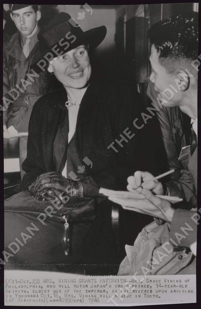(FX1-OCT.23) MRS. VINING GRANTS INTERVIEW--MRS. GRACE VINING OF PHILADELPHIA, WHO WILL TUTOR JAPAN'S CROWN PRINCE, 14-YEAR-OLD AKIHITO, ELDEST SON OF THE EMPEROR, IS INTERVIEWED UPON ARRIVING IN YOKOHAMA OCT. 16. MRS. VINING WILL RESIDE IN TOKYO.