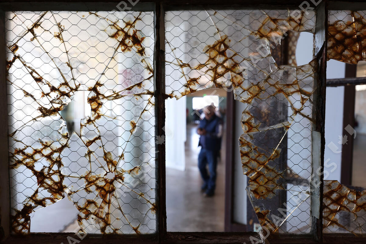 A visitor is framed by broken glass while touring Alcatraz Island in San Francisco, Monday, May 5, 2025. (AP Photo/Jed Jacobsohn)