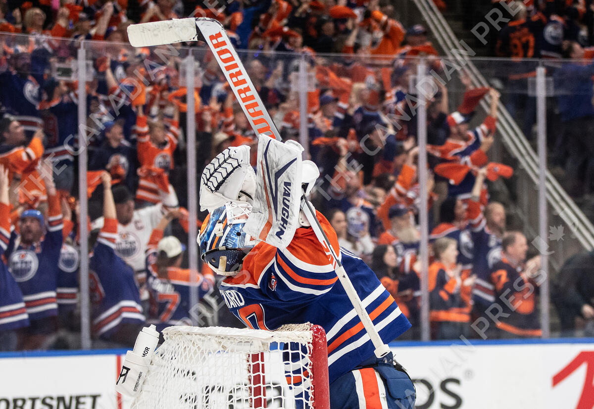 Edmonton Oilers goalie Calvin Pickard (30) celebrates the win over the Los Angeles Kings during NHL playoff action in Edmonton on Thursday, May 1, 2025. THE CANADIAN PRESS/Jason Franson