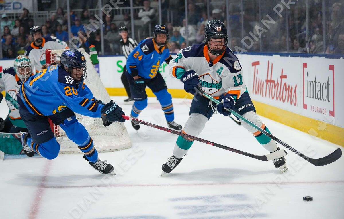 Toronto Sceptres’ Sarah Nurse (20) and New York Sirens’ Ella Shelton (17) reach for the puck during second period PWHL hockey action in Toronto on Tuesday, April 29, 2025. THE CANADIAN PRESS/Arlyn McAdorey