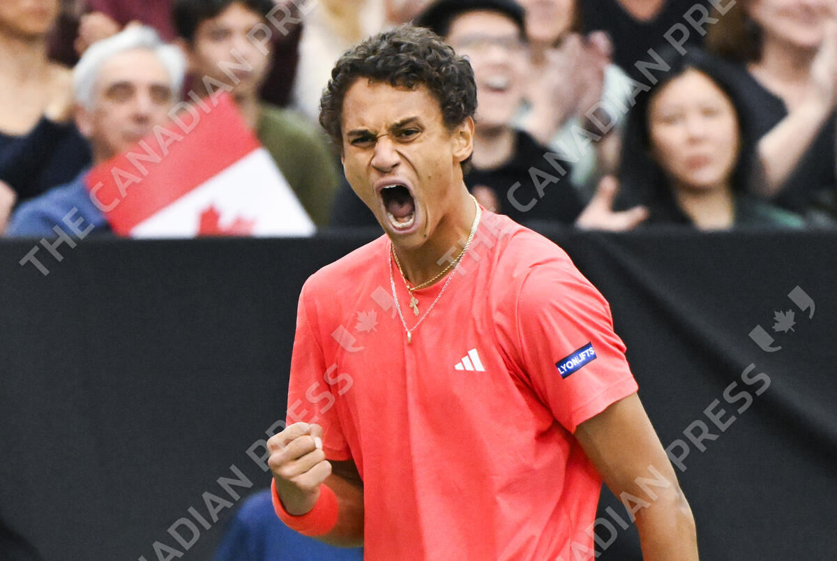Gabriel Diallo, of Canada, reacts during his Davis Cup qualifying tennis match against Fabian Marozsan, of Hungary, in Montreal on Sunday, February 2, 2025. THE CANADIAN PRESS/Graham Hughes
