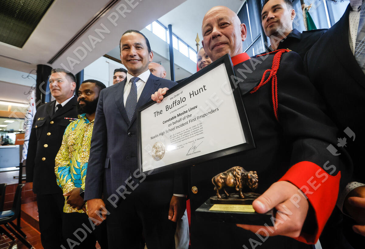 Manitoba Premier Wab Kinew, centre, awards the Order of the Buffalo Hunt to Const. Moshe Linov, Brandon Police Service, right, who represented the first responders involved in a sword attack inside a high school in June, at the Brandon City Hall in Brandon, Man. on Thursday, July 24, 2025. THE CANADIAN PRESS/John Woods