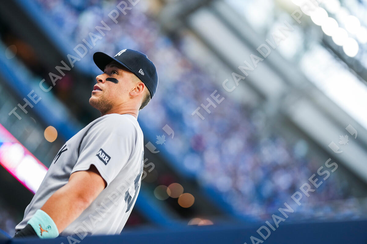 New York Yankees outfielder Aaron Judge (99) looks on against the Toronto Blue Jays during fourth inning MLB baseball action in Toronto on Monday, July 21, 2025. THE CANADIAN PRESS/Thomas Skrlj