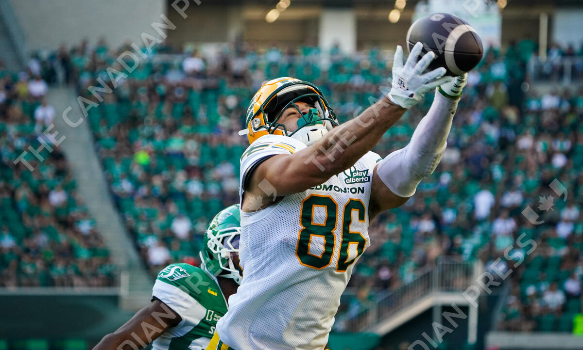 Edmonton Elks receiver Arkell Smith (86) makes a catch against the Saskatchewan Roughriders during the first half of CFL football action in Regina, on Friday, July 25, 2025. THE CANADIAN PRESS/Heywood Yu