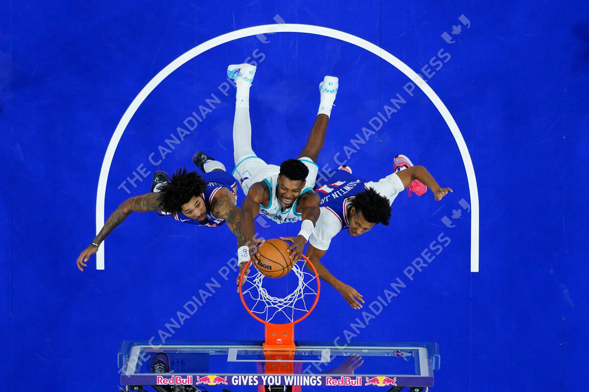 Charlotte Hornets' Brandon Miller, center, dunks between Philadelphia 76ers' Kelly Oubre Jr., left, and Jeff Dowtin Jr. during the second half of an NBA basketball game, Sunday, Nov. 10, 2024, in Philadelphia. (AP Photo/Matt Slocum)