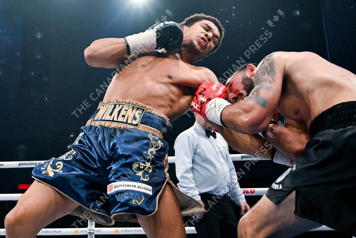 Wilkens Mathieu, left, lands a blow to Marcos Karalitzky during their light heavyweight fight in Montreal, Thursday, November 7 2024. THE CANADIAN PRESS/Graham Hughes