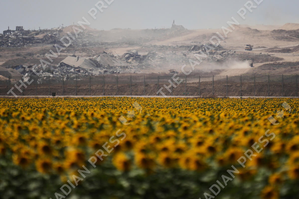 Destroyed buildings in the Gaza Strip are seen beyond a sunflower field on the Israeli side of the border with Gaza, Monday, May 19, 2025. (AP Photo/Ohad Zwigenberg)