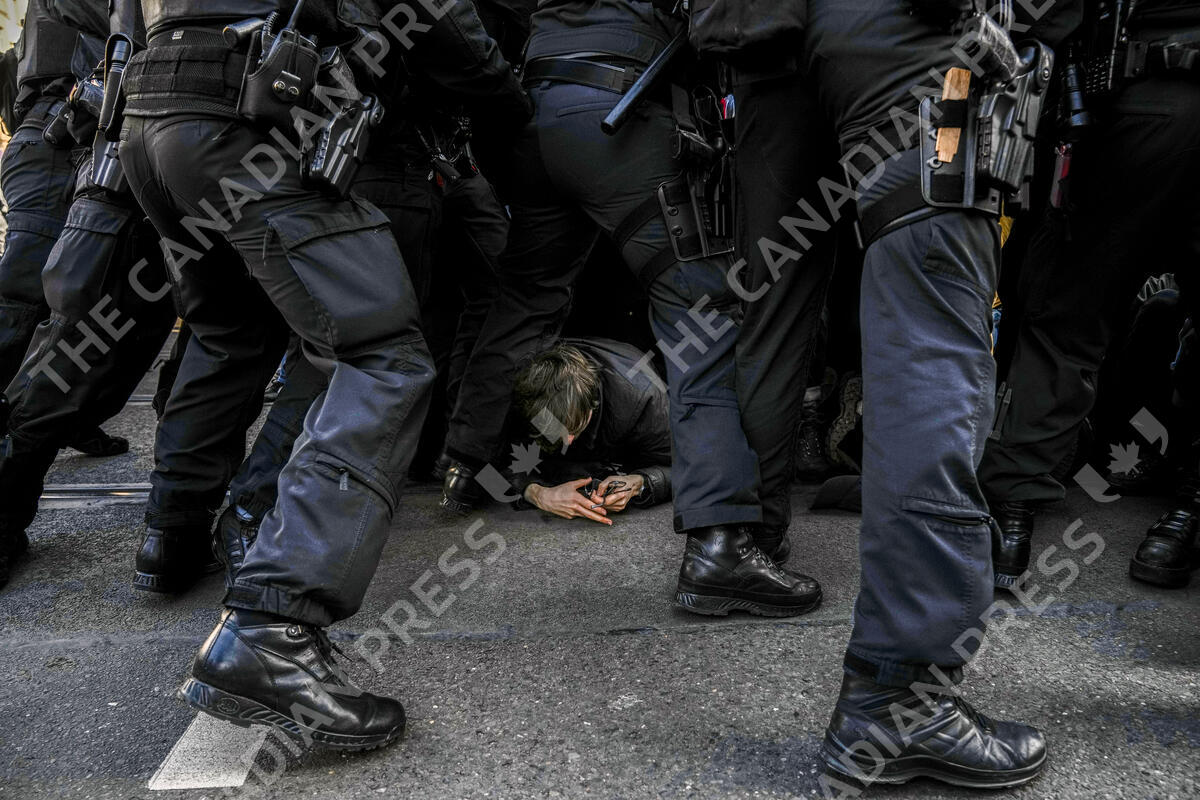 Police officers remove anti-far-right protesters blocking the route of a far right demonstration, a day before the German election, in Berlin, Germany, Saturday, Feb. 22, 2025. (AP Photo/Ebrahim Noroozi)