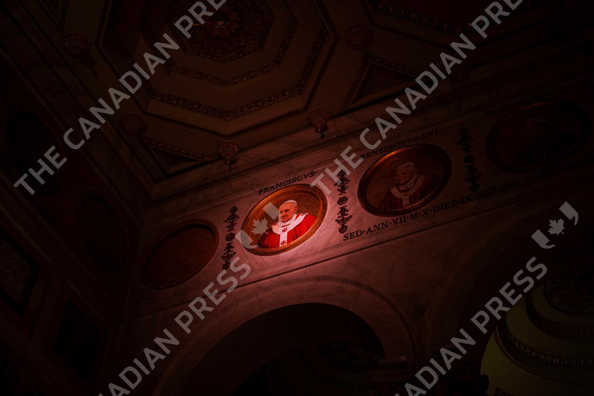 A light illuminates a polychrome mosaic portrait of Pope Francis placed on the frieze of St. Paul's Outside The Walls Basilica in Rome, Wednesday, Feb. 26, 2025. (AP Photo/Bernat Armangue)