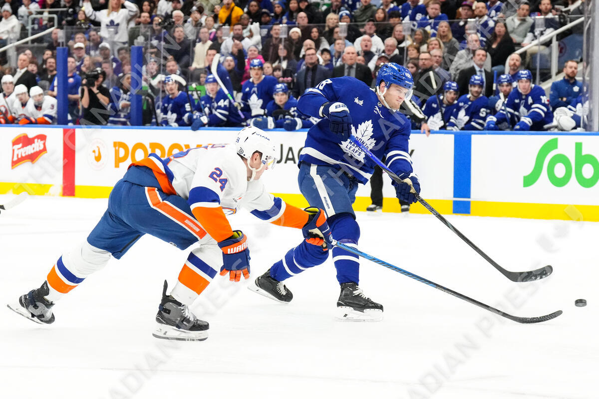 Toronto Maple Leafs centre Steven Lorentz (18) scores his team's second goal as New York Islanders defenceman Scott Mayfield (24) tries to cover during second period NHL hockey action in Toronto on Tuesday, December 31, 2024.THE CANADIAN PRESS/Chris Young