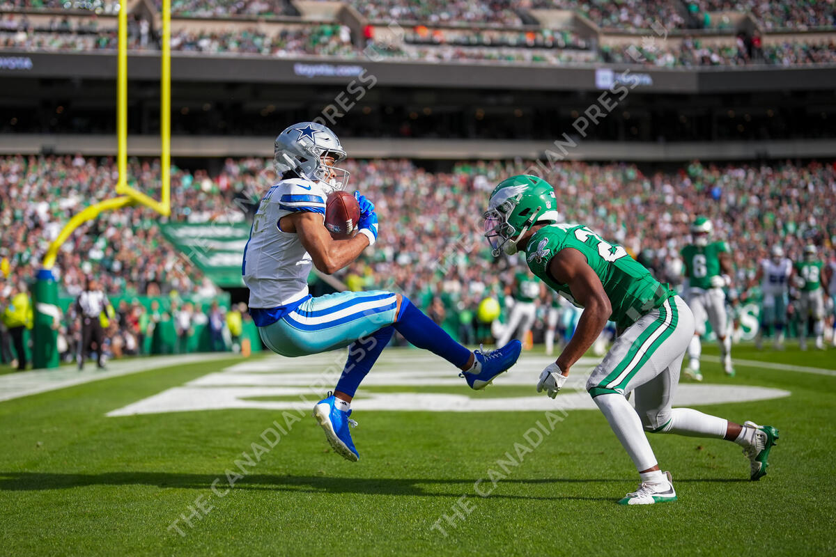 Dallas Cowboys wide receiver Jalen Tolbert, left, catches a touchdown pass in front of Philadelphia Eagles cornerback Quinyon Mitchell during the first half of an NFL football game, Sunday, Dec. 29, 2024, in Philadelphia. (AP Photo/Matt Slocum)