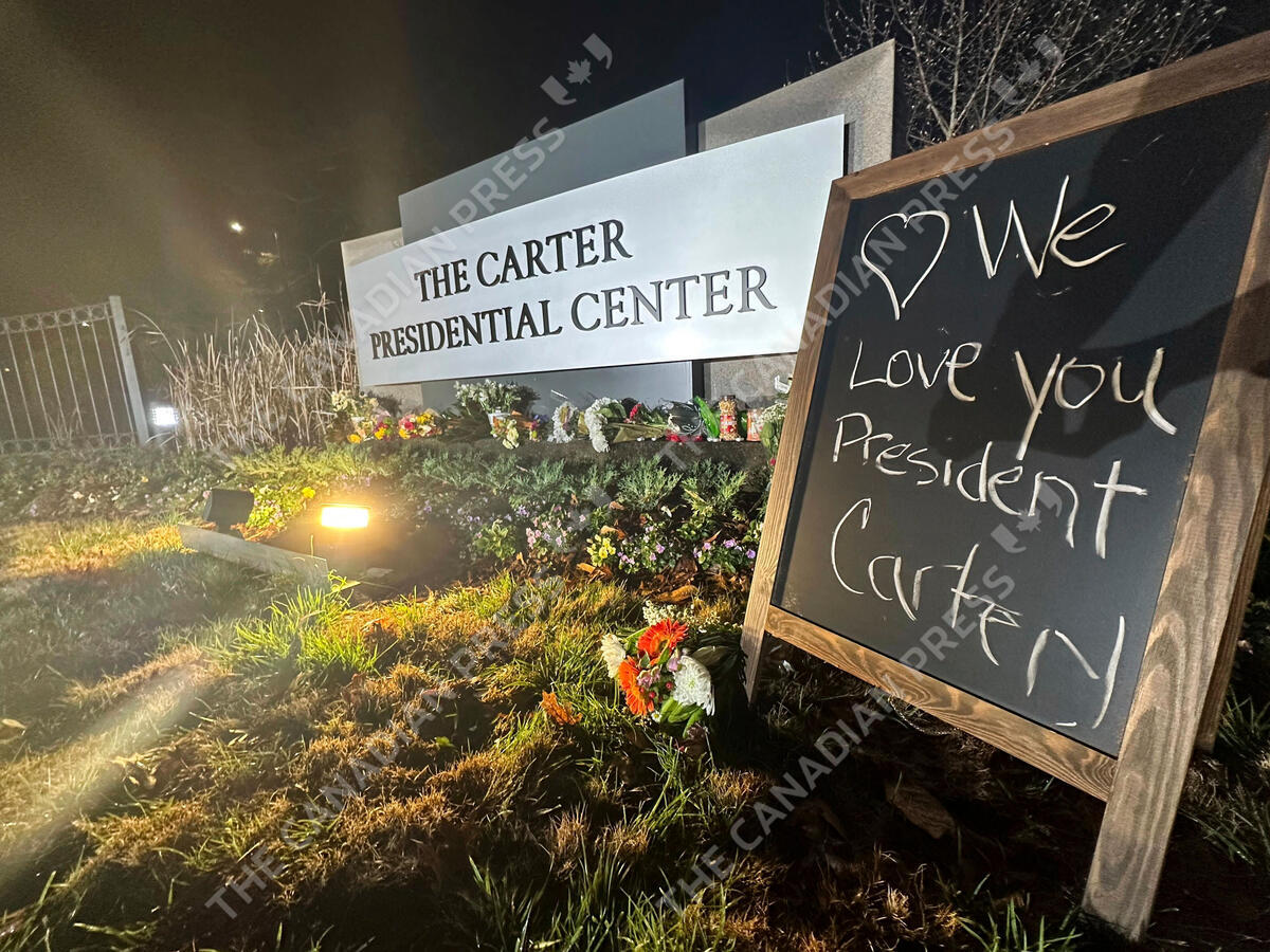 A sign and flowers sit outside the Carter Presidential Center after the death of former President Jimmy Carter, Sunday, Dec. 29, 2024, in Atlanta. (AP Photo/Ron Harris)