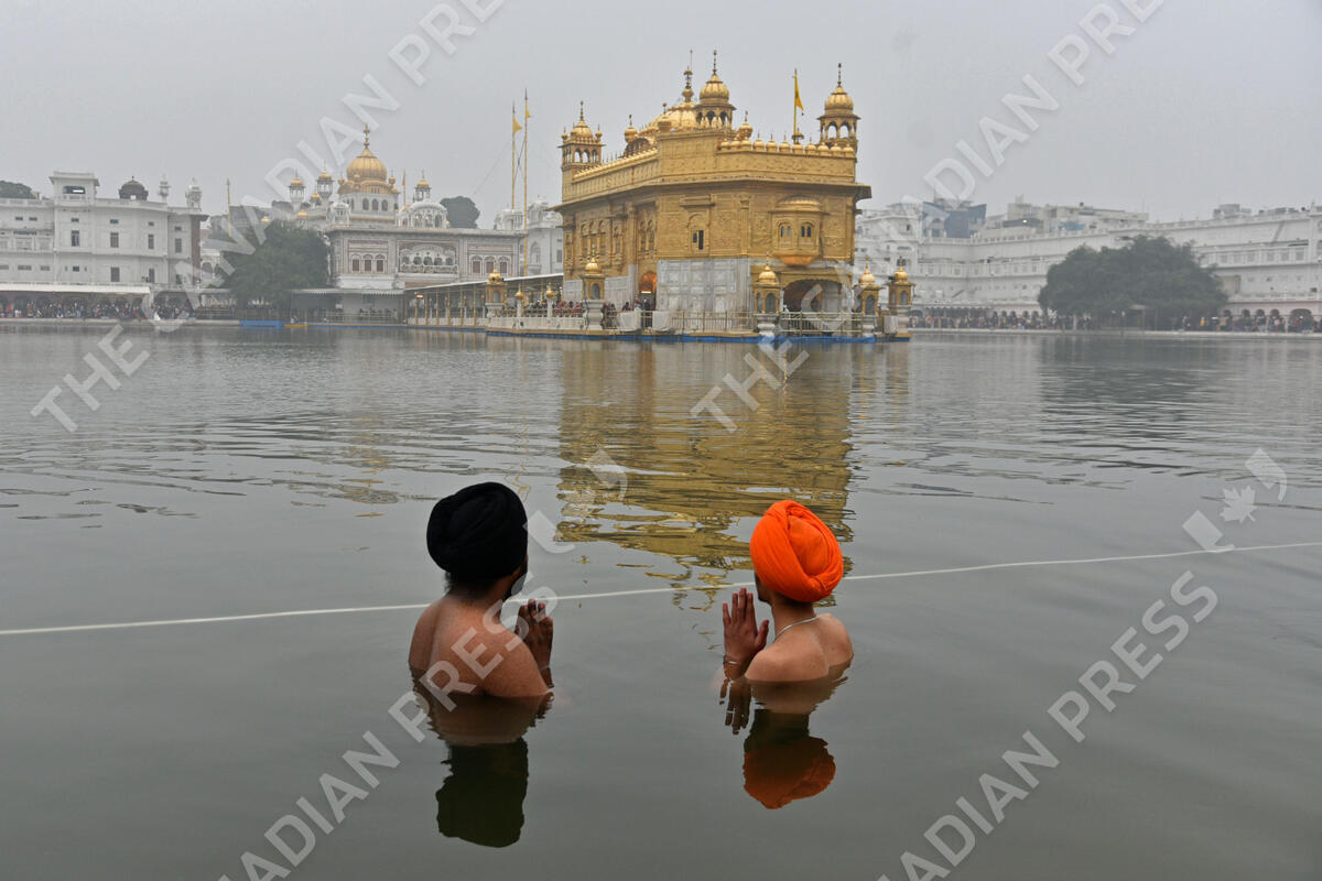 Sikh devotees pray while standing in the pond surrounding the Golden Temple, the holiest shrine for the Sikhs, on New Year's Day in Amritsar, India, Wednesday, Jan. 1, 2025. (AP Photo/Prabhjot Gill)