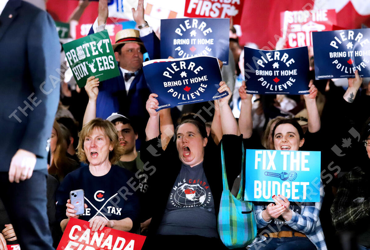 Supporters cheer as Conservative Leader Pierre Poilievre makes a speech during a rally in Sudbury, Ont. on Wednesday, March 19, 2025. THE CANADIAN PRESS/Gino Donato