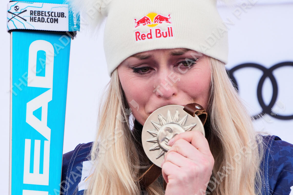 Second place finisher United States' Lindsey Vonn reacts during a medal ceremony for women's super-G at the World Cup Finals, Sunday, March 23, 2025, in Sun Valley, Idaho. (AP Photo/John Locher)