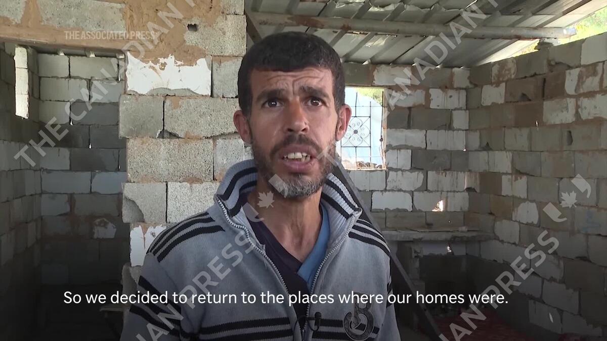 Jihad Abu Yusuf's home in the southern Gaza Strip was whole when he left it. After a year of being displaced, he returned to find no more than a pile of rubble. Rather than live in a tent with other displaced families, the father of two has started to build a small house using material from the rubble of his old home. (AP Video: Mohammad Jahjouh)