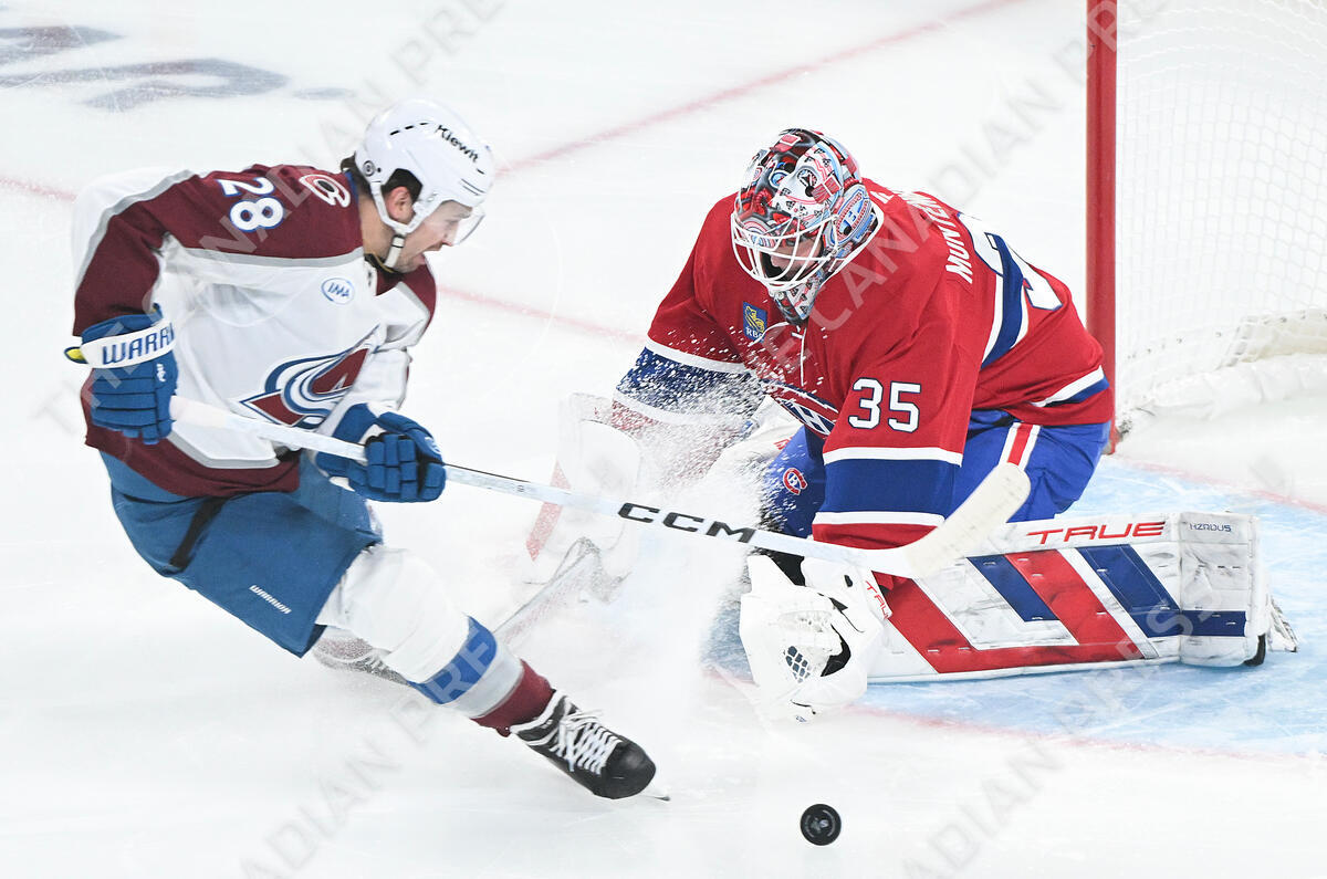 Colorado Avalanche's Miles Wood (28) moves in on Montreal Canadiens goaltender Sam Montembeault during first period NHL hockey action in Montreal, Saturday, March 22, 2025. THE CANADIAN PRESS/Graham Hughes