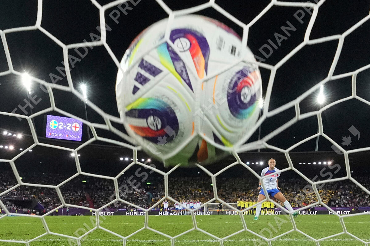 England's Lucy Bronze scores a penalty past Sweden goalkeeper Jennifer Falk during a shootout of the Women's Euro 2025 quarterfinals soccer match between Sweden and England at Stadion Letzigrund in Zurich, Switzerland, Thursday, July 17, 2025. (AP Photo/Martin Meissner)
