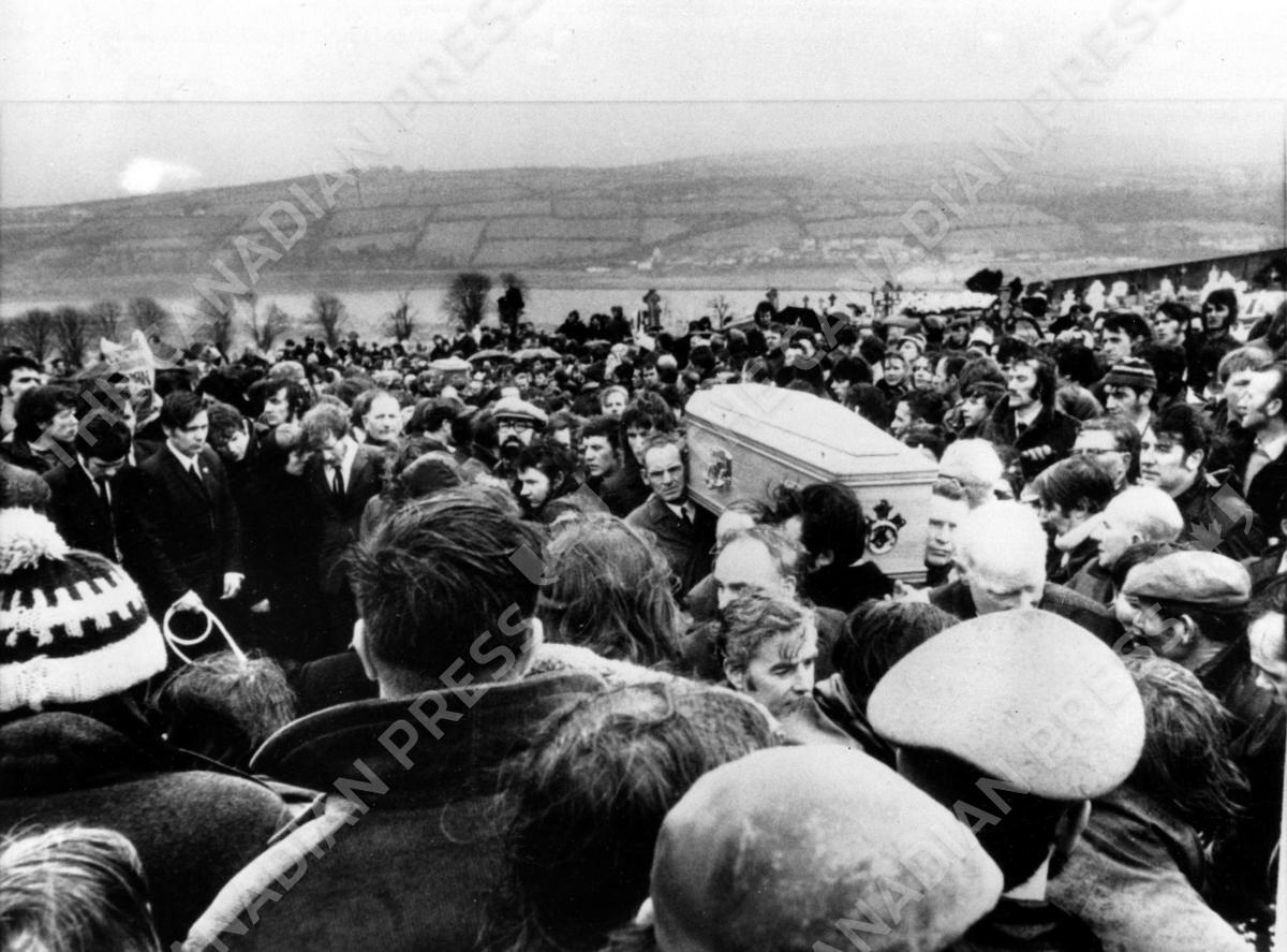FILE - In this Feb. 2, 1972 file photo, pallbearers carry one of 13 coffins of Bloody Sunday victims to a graveside during a funeral in Londonderry, Northern Ireland, following requiem mass at nearby St. Mary's church at Creggan Hill. A former British soldier is set to be prosecuted in connection with the deaths of two civil rights protesters in Northern Ireland more than 40 years ago, part of an event known as Bloody Sunday. (AP Photo/File)