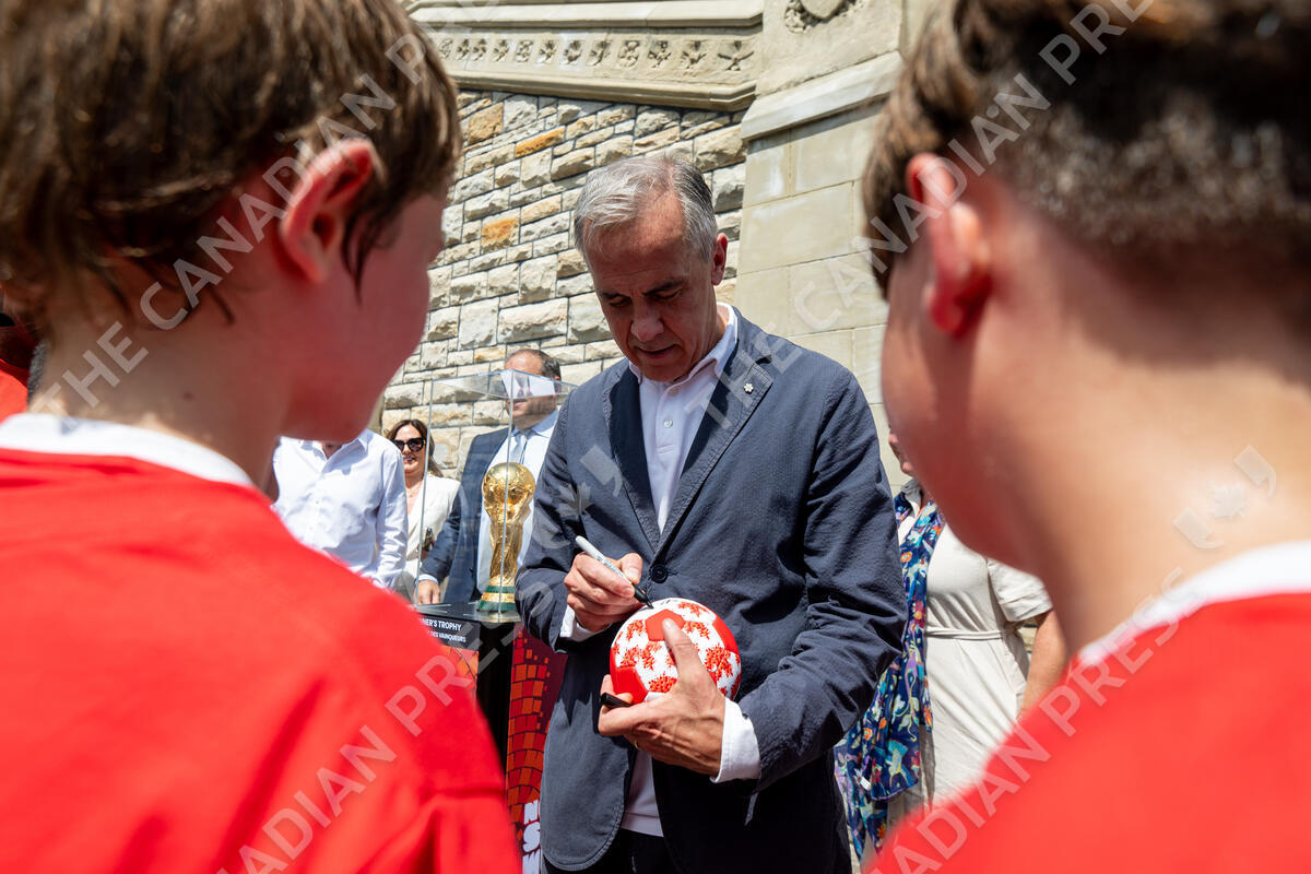 Prime Minister Mark Carney signs a miniature FIFA soccer balls during a break in a youth soccer game on Parliament Hill marking the upcoming FIFA World Cup championships in Ottawa, on Monday, June 30, 2025. THE CANADIAN PRESS/Spencer Colby