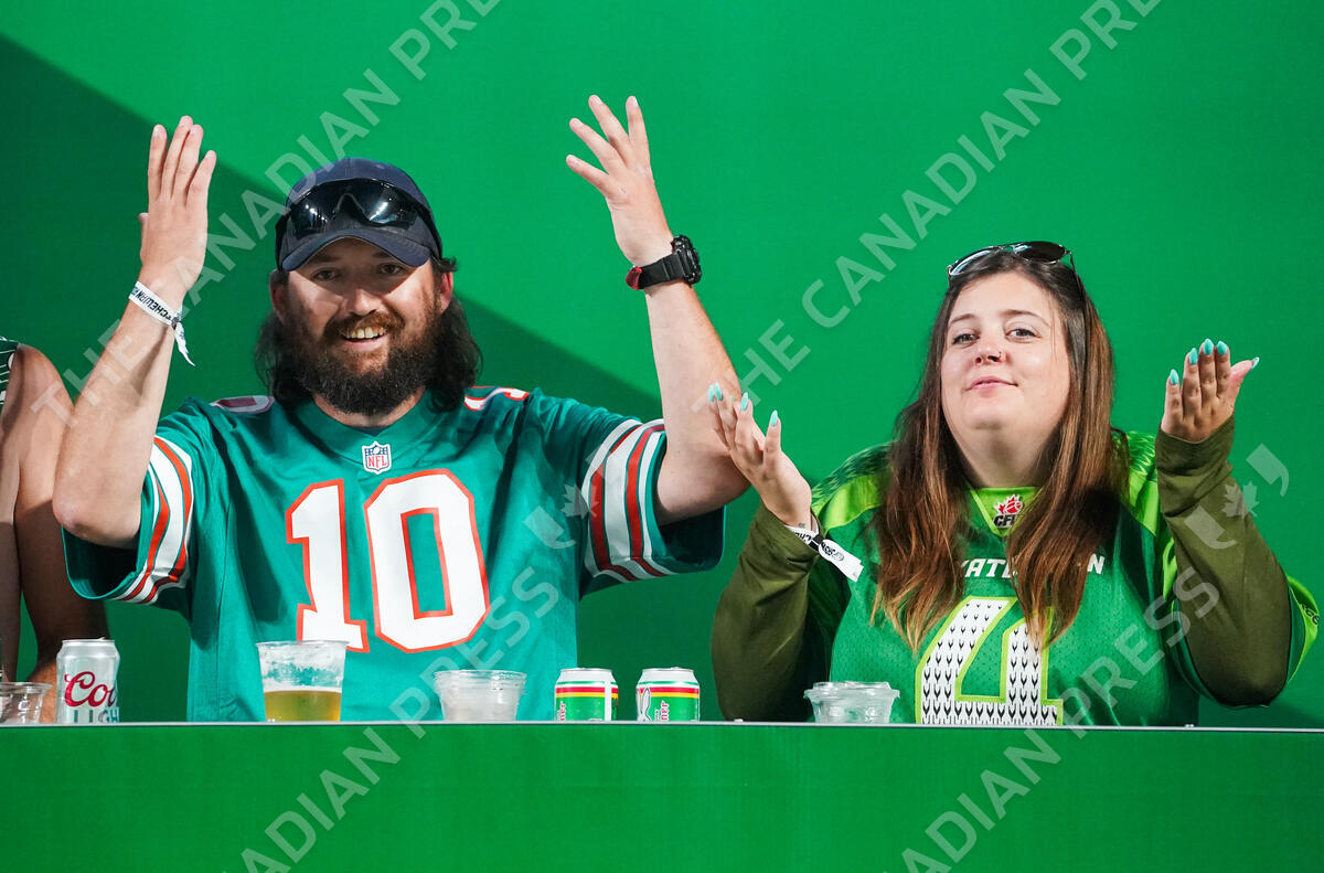 Spectators react after CFL football action between the Saskatchewan Roughriders and the Calgary Stampeders got postponed to the next day in Regina, on Friday, July 11, 2025. THE CANADIAN PRESS/Heywood Yu