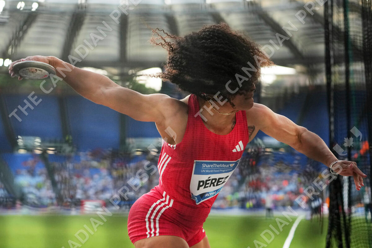 Yaime Perez, of Cuba, makes an attempt in the women discus throw at the Diamond League Golden Gala Pietro Mennea athletics meet at the Stadio Olimpico in Rome, Friday, June 6, 2025. (AP Photo/Alessandra Tarantino)