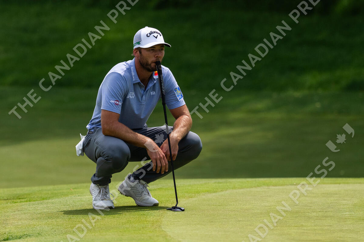 Sam Burns inspects the green on the 10th hole during the final round of the RBC Canadian Open golf tournament in Caledon, Ont., Sunday, June 8, 2025. THE CANADIAN PRESS/Andrew Lahodynskyj