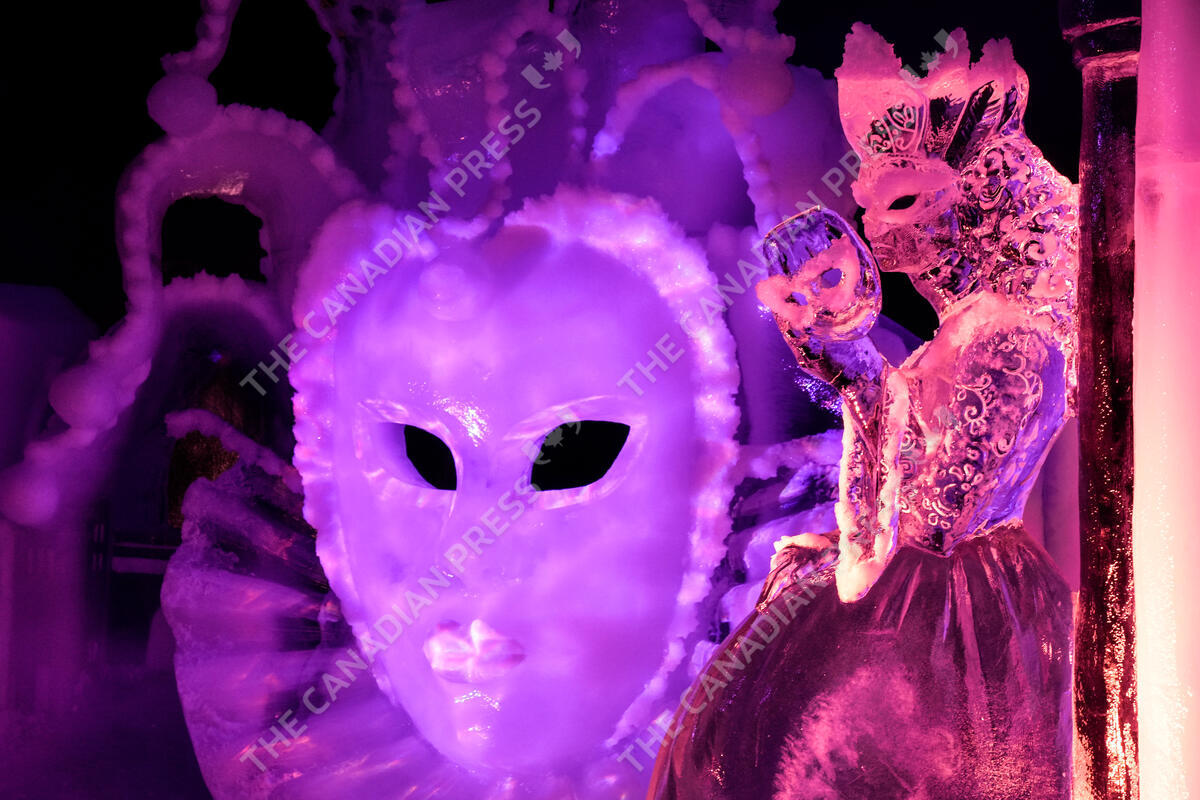 An ice-cold artwork, depicting the carnival of Venice, is seen at an ice and snow sculpture exhibition made by 35 international artists, who worked 4 months at minus eight degrees Celsius in Oberhausen, Germany, on the 1st of Advent, Sunday, Dec. 1, 2024. (AP Photo/Martin Meissner)