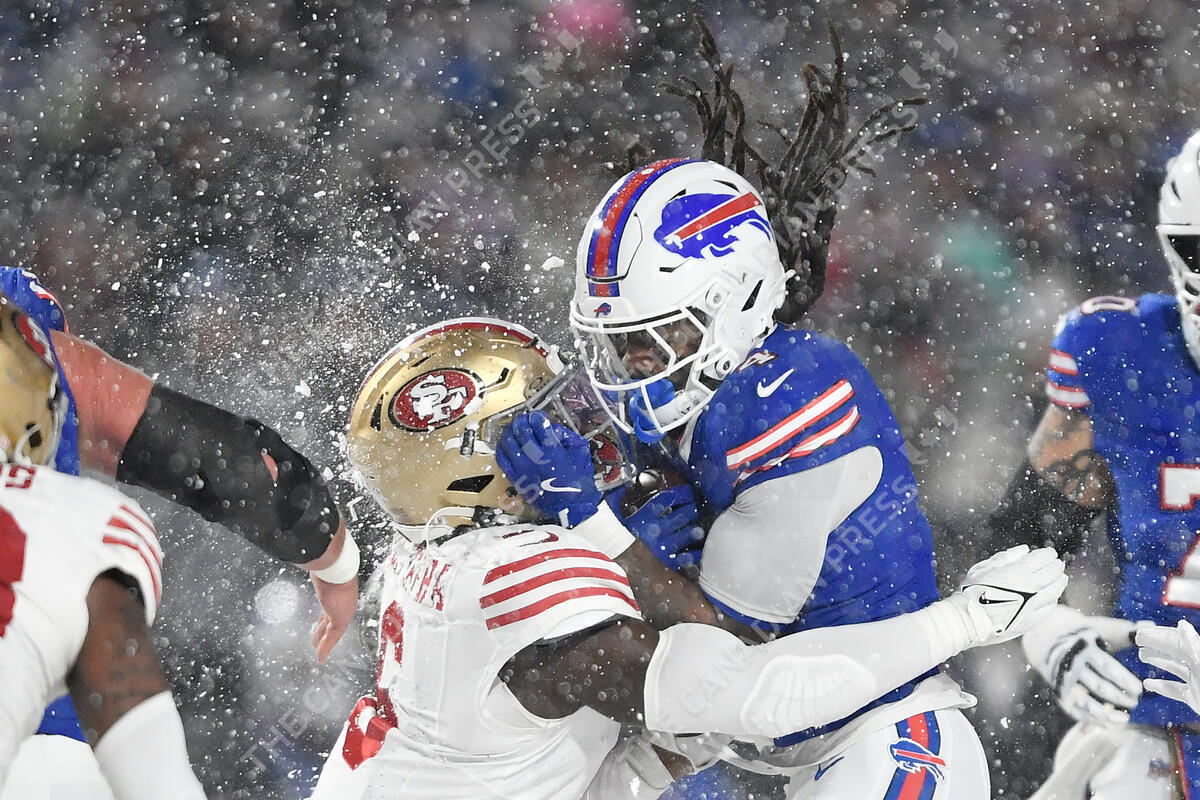 Buffalo Bills running back James Cook, middle right, is hit by San Francisco 49ers safety Malik Mustapha during the first half of an NFL football game in Orchard Park, N.Y., Sunday, Dec. 1, 2024. (AP Photo/Adrian Kraus)
