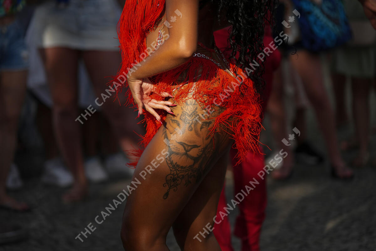 A performer dances during Samba Day celebrations on Urca Mountain in Rio de Janeiro, Monday, Dec. 2, 2024. (AP Photo/Silvia Izquierdo)